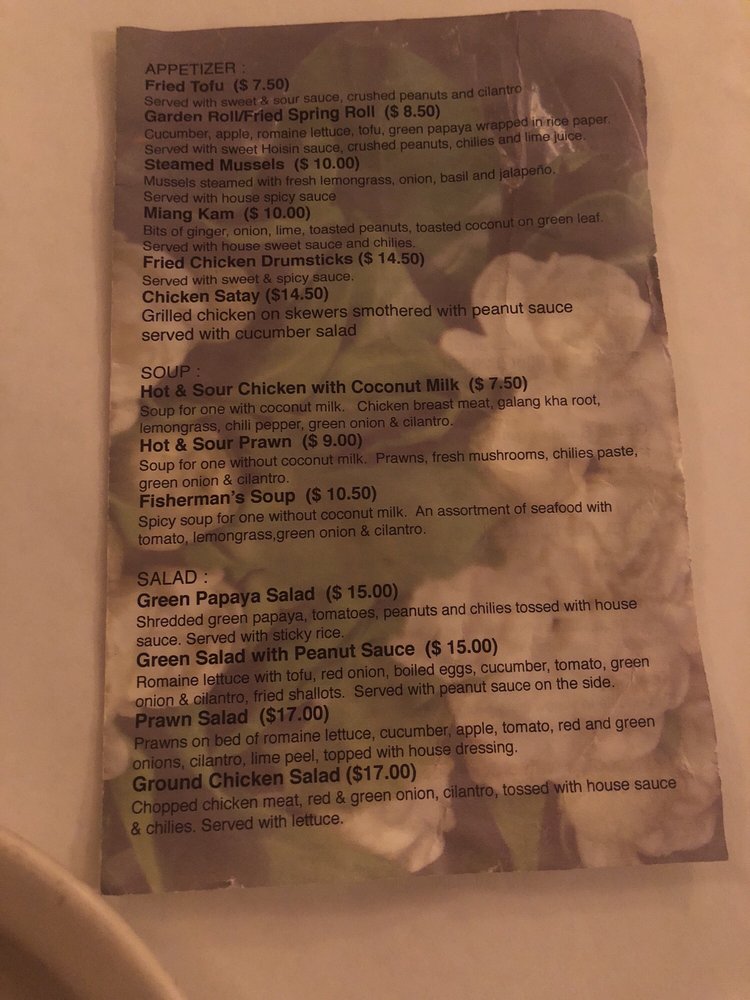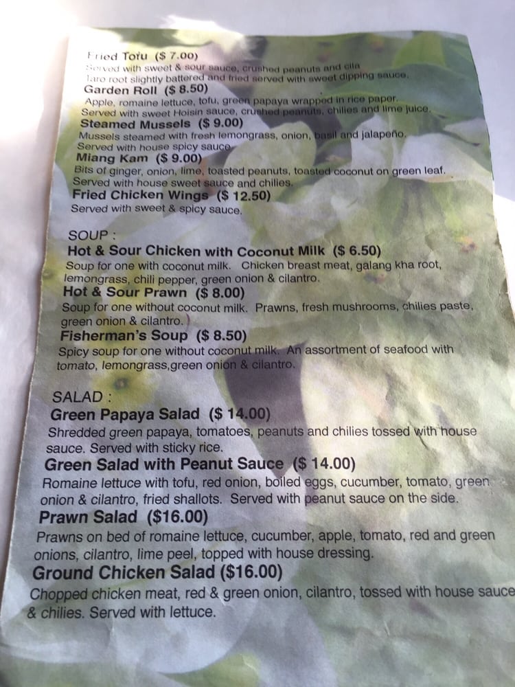 - Salads: Try the Prawn Salad featuring fresh prawns, apples, and house dressing, or the spicy Ground Chicken Salad, both priced at $16.00.